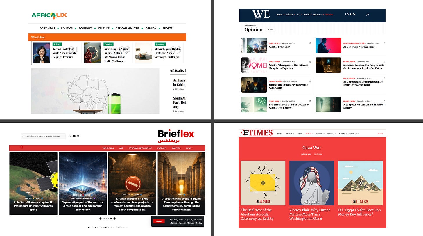 Yet what may look like to some a handful of young influencers expressing strong political views turns out to be something far more organised. Behind the personal brands sits what appears to be a tightly interconnected media ecosystem: newly created or reactivated X accounts, a cluster of English and Arabic pseudo-news sites spreading disinformation, AI-generated articles and a constant churn of content that circulates through the same channels, using the same type of language, the same visuals, and often the same studios. Perhaps most bizarrely, it even involves a series of books that look to have been written by AI.