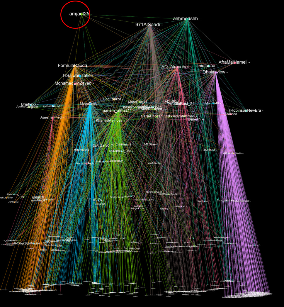 This relationship is reciprocal. Analysis of all the tweets from the circle of influencers reveals that Amjad Taha has the highest level of ‘relevance’ of all the accounts whose data was scraped. This indicates that Taha is seen as an important node for all the influencers, who place a premium on his content. In other words, the hierarchy suggests the gang also exists to boost and promote Amjad Taha.
