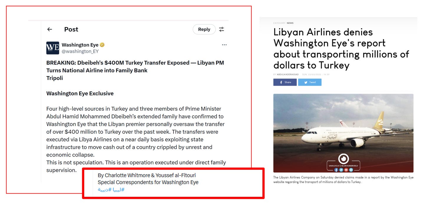 It is the Washington Eye that provides an interesting example of narrative laundering that underpins its function as a pseudo-news site. In May 2025, the Washington Eye’s published an ‘exclusive’ story that claimed that the Libyan PM transferred $400 million to Turkey. Naturally the story implicates the Muslim Brotherhood. The story in question was written by ‘Charlotte Whitmore’ & ‘Youssef al-Fitouri’ who seem to be entirely fabricated, and do not appear on the Washington Eye’s author list. The story was denied by other Libyan media, and removed from the Washington Eye’s website - presumably by the editor in chief - although it remained one of their most shared stories on X - where it was not deleted.