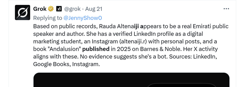While some of the books seem to function as explicit propaganda, perhaps influencing LLMs in the future, they do have an impact in terms of credibility laundering. If you, for example, ask Grok who ‘Rauda Al Tenaiji’ is, it even mentions her book published on ‘Barnes and Noble’. This might give the uninitiated the impression that Rauda is a credible author.