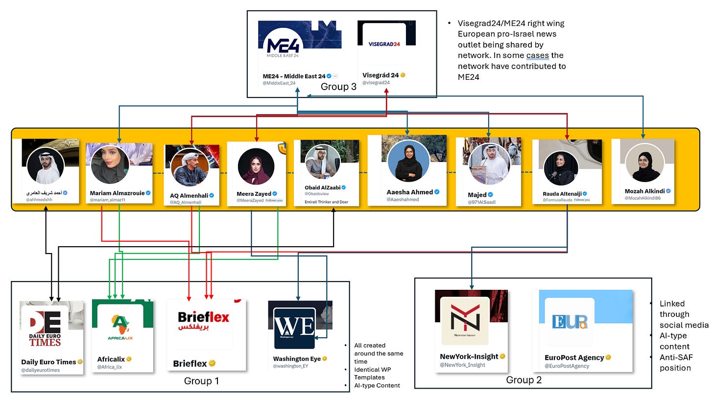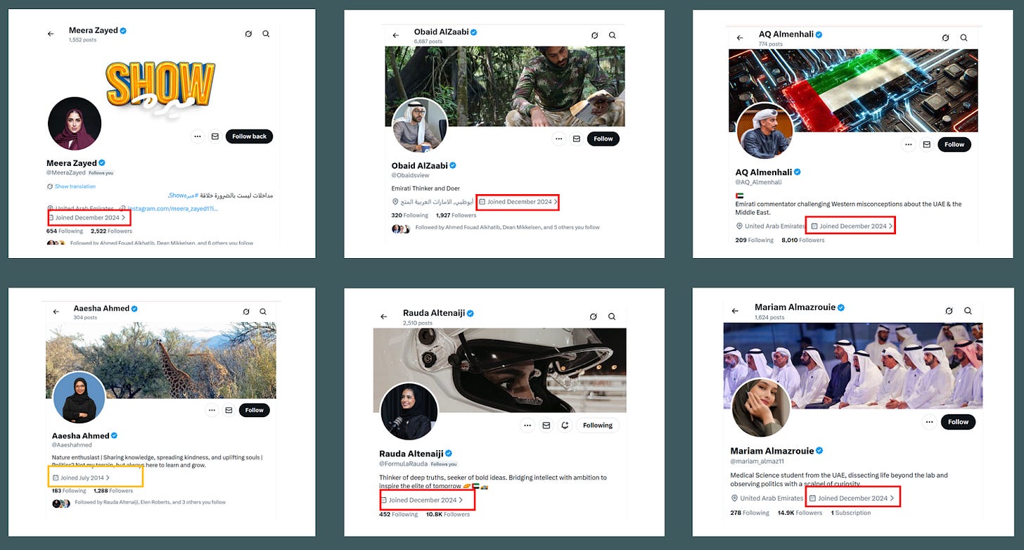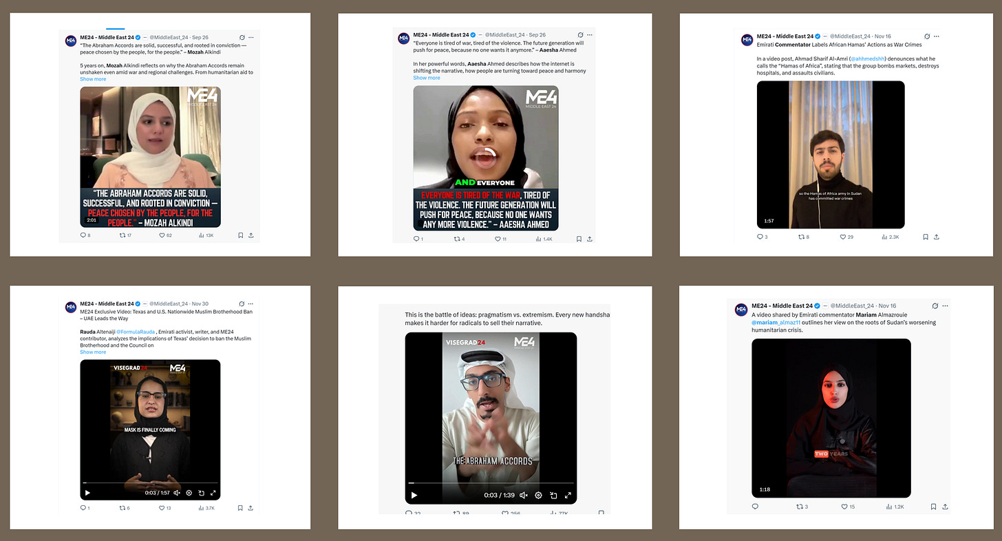 This post is quite long, and proceeds in four parts. First, it maps the cluster of Emirati-based influencers that emerged or reactivated their accounts in late 2024. Second, it examines the pseudo-news outlets that provide these accounts with legitimacy and amplification, as well as other tactics and techniques. Third, it traces the connective role played by Amjad Taha and his company, Crestnux Media, in promoting and sustaining this ecosystem. Finally, it explores the intersection with the Polish right wing media system Visegrad24.