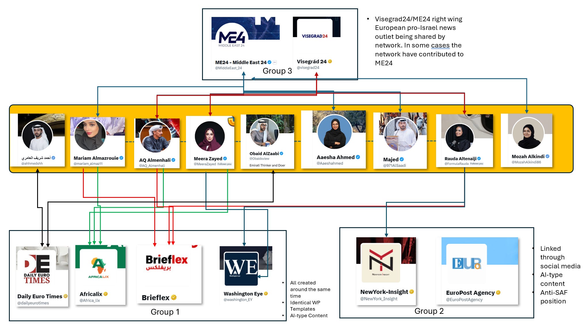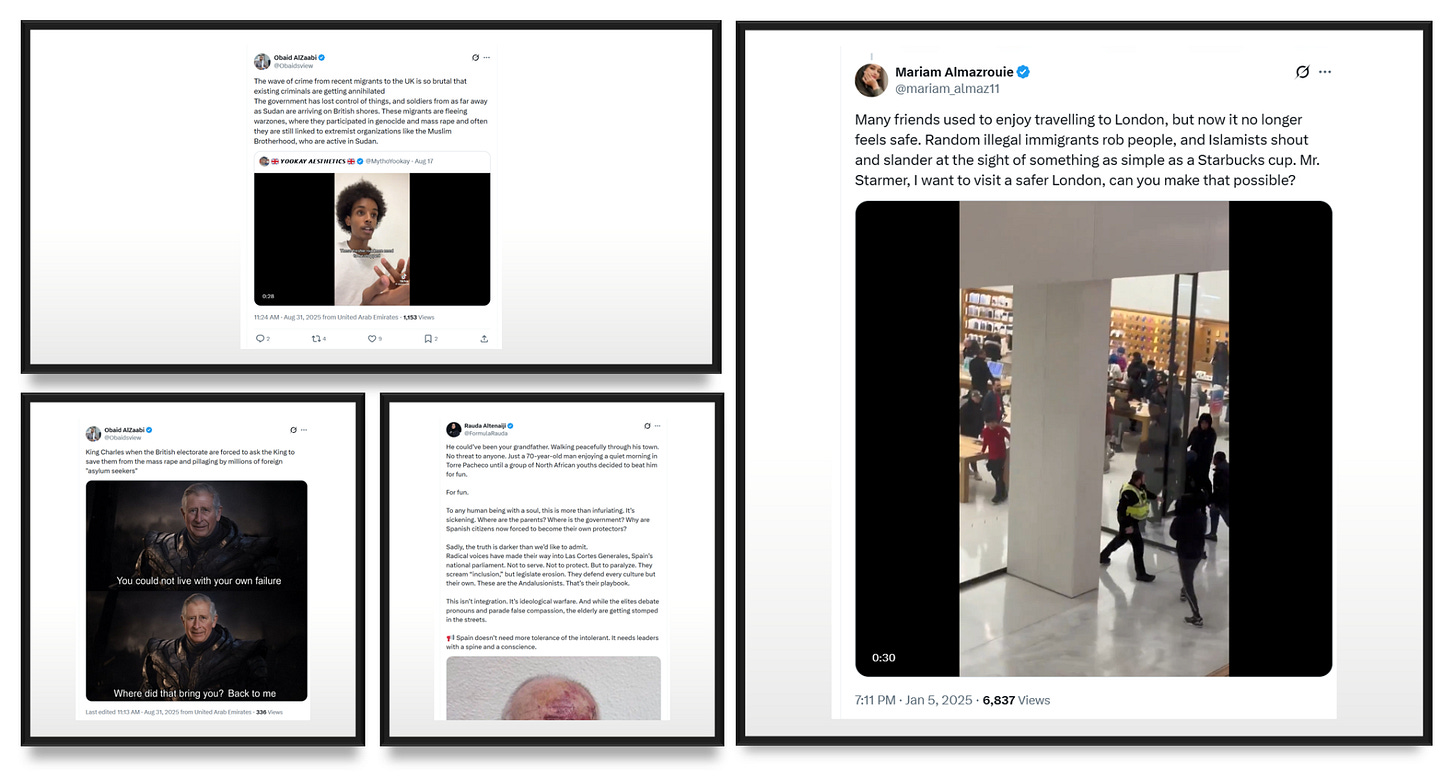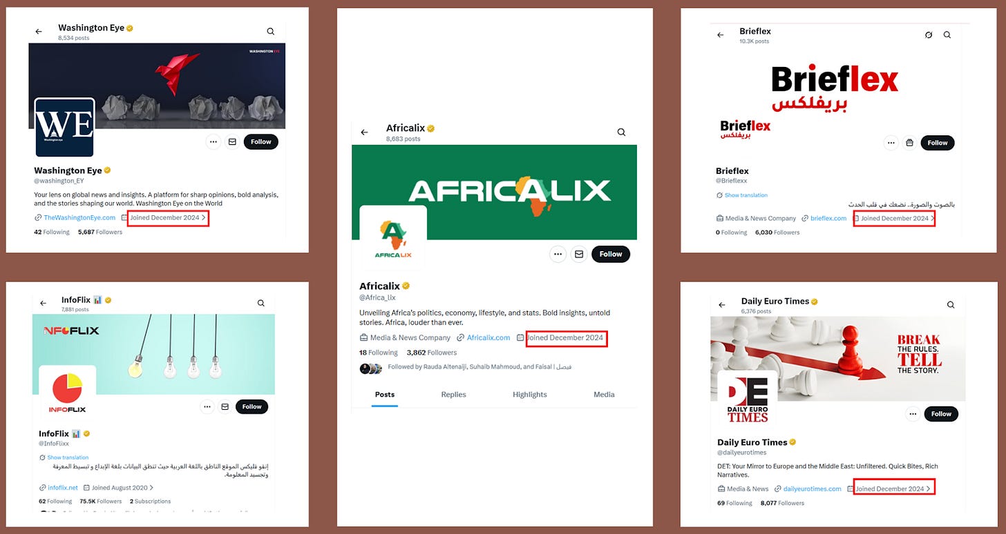 This post is quite long, and proceeds in four parts. First, it maps the cluster of Emirati-based influencers that emerged or reactivated their accounts in late 2024. Second, it examines the pseudo-news outlets that provide these accounts with legitimacy and amplification, as well as other tactics and techniques. Third, it traces the connective role played by Amjad Taha and his company, Crestnux Media, in promoting and sustaining this ecosystem. Finally, it explores the intersection with the Polish right wing media system Visegrad24.