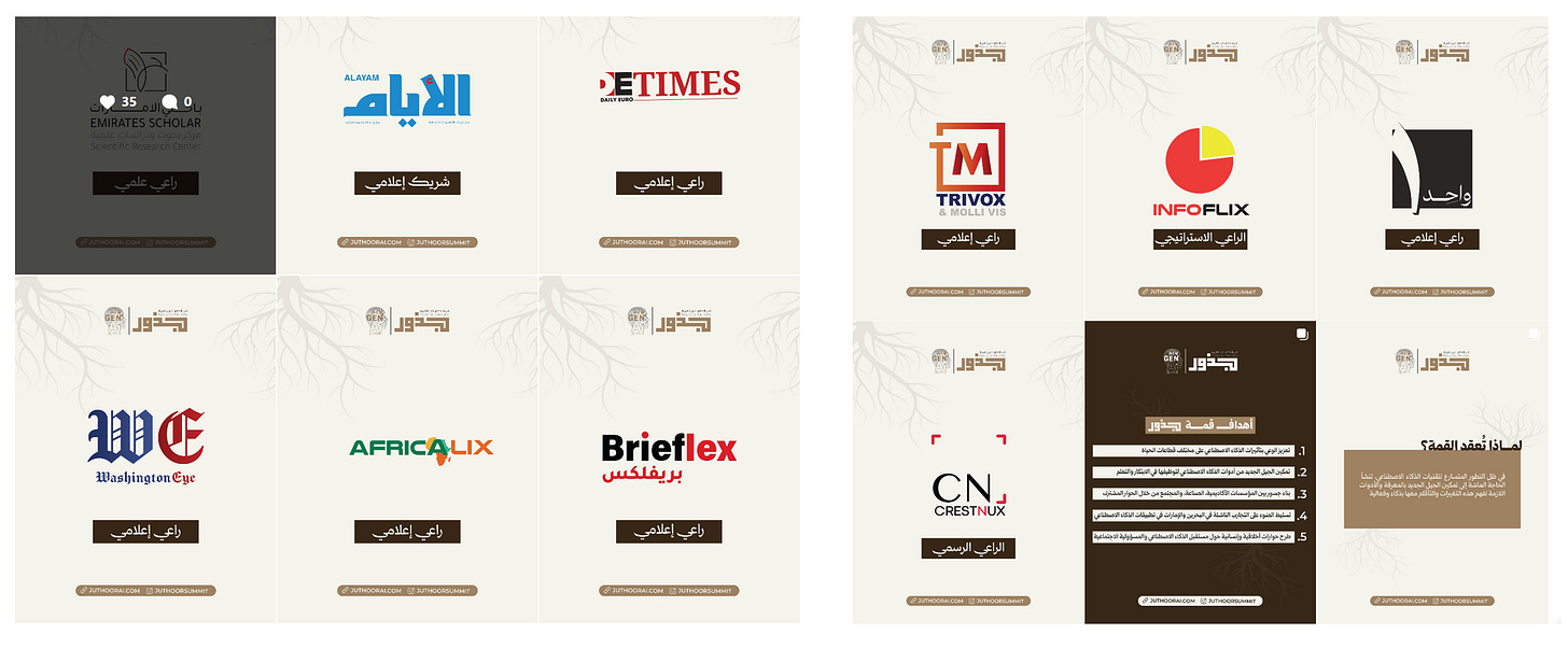 All X accounts have gold checkmarks, indicating a spend of between 200-1000 USD per month. This suggests a premium is placed on social media reach. X states all the accounts are based in ‘West Asia’. All of these outlets, in addition to Crestnux Media (more on this soon), were also sponsors for an event in Bahrain on AI called Juthoor.