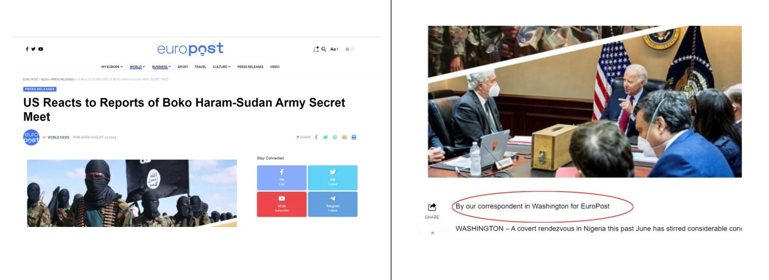 In August 2023, EuroPost’s website published an article alleging links between the SAF and Boko Haram, an entirely unsubstantiated piece of news. The article circulated primarily through pro-RSF social media accounts and attracted immediate concern from researchers and activists, who found no substantiation of these claims. The Boko Haram article claimed to be written by an in-house ‘Washington correspondent’. When the text was traced further, it also appeared on a Medium blog authored by an individual using the name “Carol,” whose only other writing concerned Sudan and alleged Egyptian military involvement via drone support. EuroPost bigs up its credentials. In one post, for example, it claimed that White House sources were communicating with EuroPostAgency.