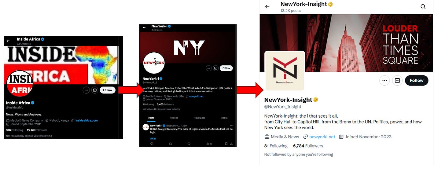 There are other suspiciously shoddy elements to New York Insight. None of the social icons actually linked to the channel’s social media outlets. Its X (Twitter) account is somewhat sketchy and inauthentic. It was created in November 2023, and was only following one account at that time, called ‘Inside Africa’. Inside Africa was then suspended. New York Insight then updated its brand, and added a slogan “Louder than Times Square”.