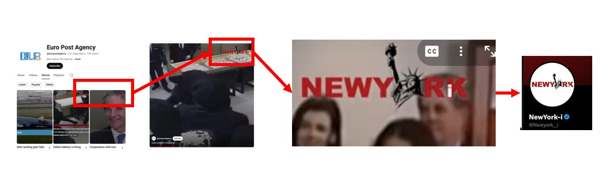 In a strange but serendipitous moment, when looking into EuroPost Agency’s Youtube channel, I noticed something strange. A bunch of the shorts had watermarks that did not look like the Europost logo. They were the logo from New York Insight! At the time I had not heard of New York Insight, so I made some notes about it and moved on. It was only when Rauda posted her op-ed that I became fascinated that she had happened to publish on a strange site I had identified previously.