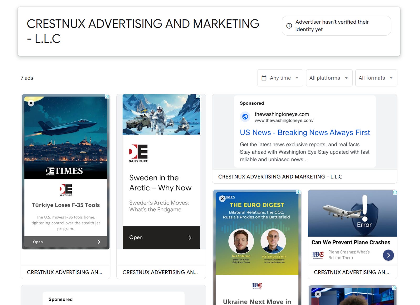 Perhaps one of the most telling and interesting connections between Taha and a number of members of the Gang is the fact that his company, Crestnux, ran ads for the Daily Euro Times and the Washington Eye in February and March 2025.