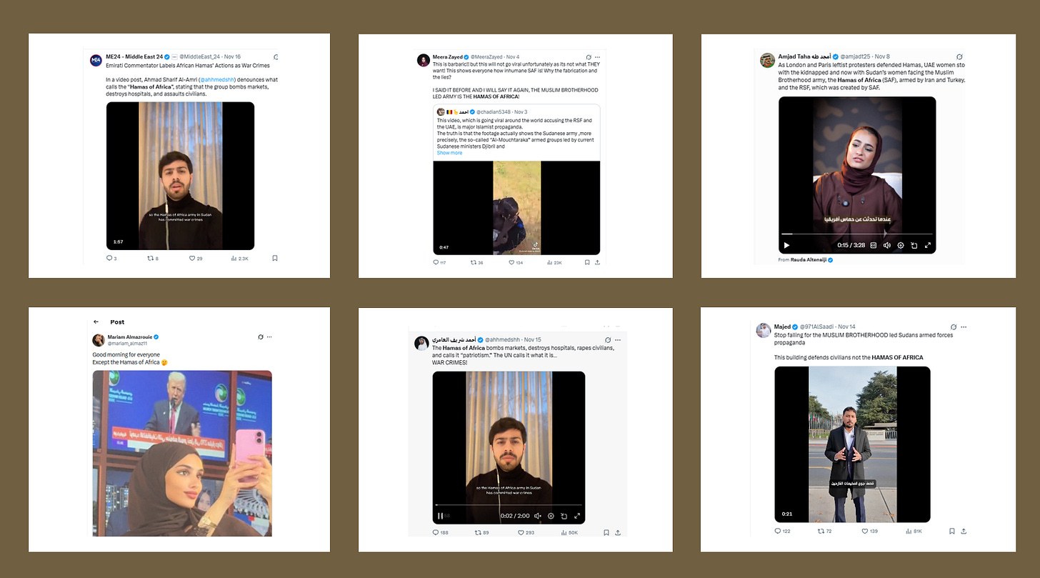 The pattern is consistent: simultaneous creation, converging appearances, shared studios, identical narrative fixations. The Muslim Brotherhood appears relentlessly—as the explanation for environmental destruction, the Sudanese war European migration, Gaza, and the Sydney terrorist attacks. Hamas is reframed as the “Hamas of Africa.” Migration becomes a security threat. Israel becomes a defensive outpost of Western order. The talking points circulate through the pseudo-news sites, get amplified by the influencer accounts, and even appear in books published through AuthorHouse that read like they were generated by ChatGPT.