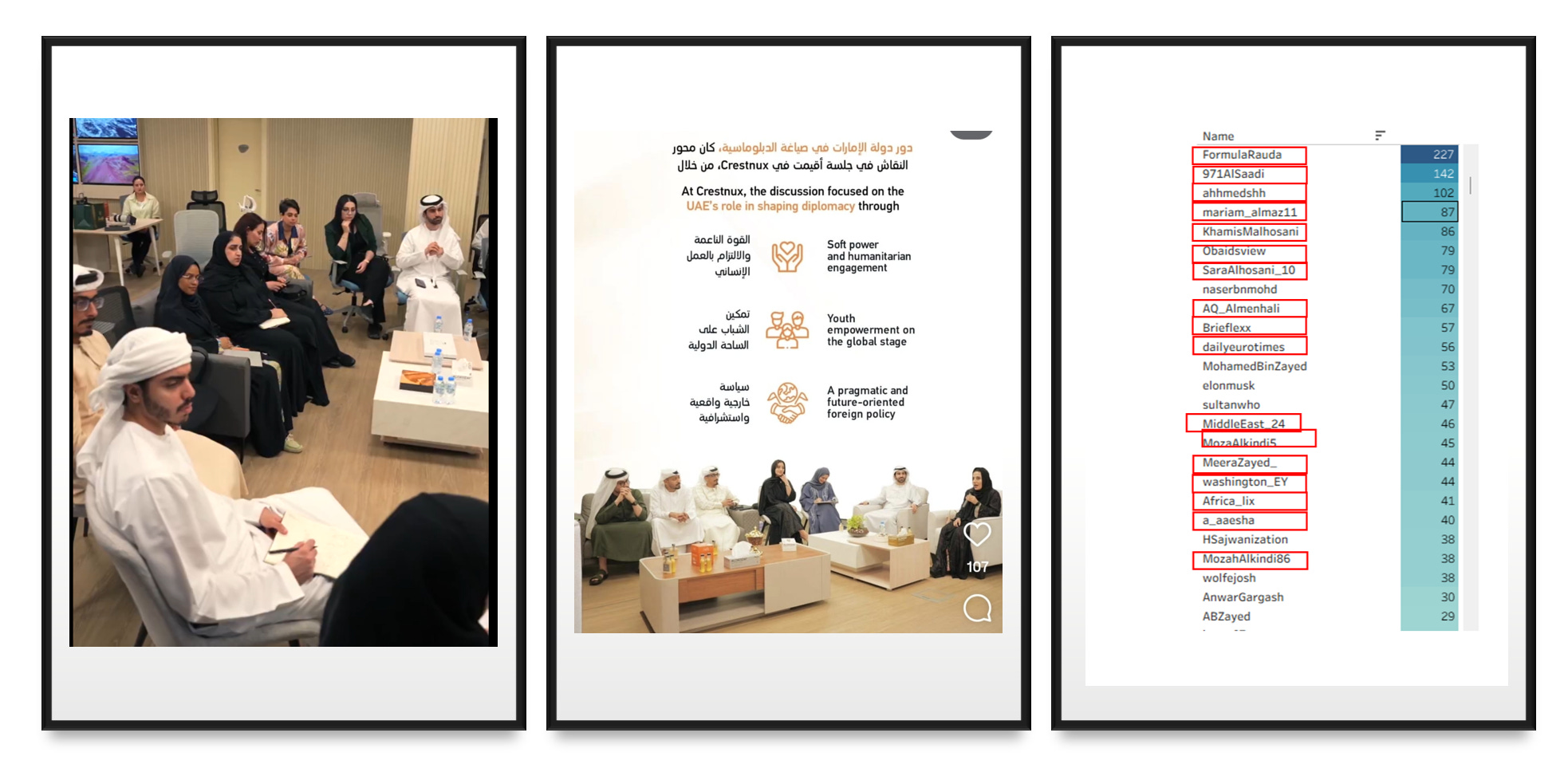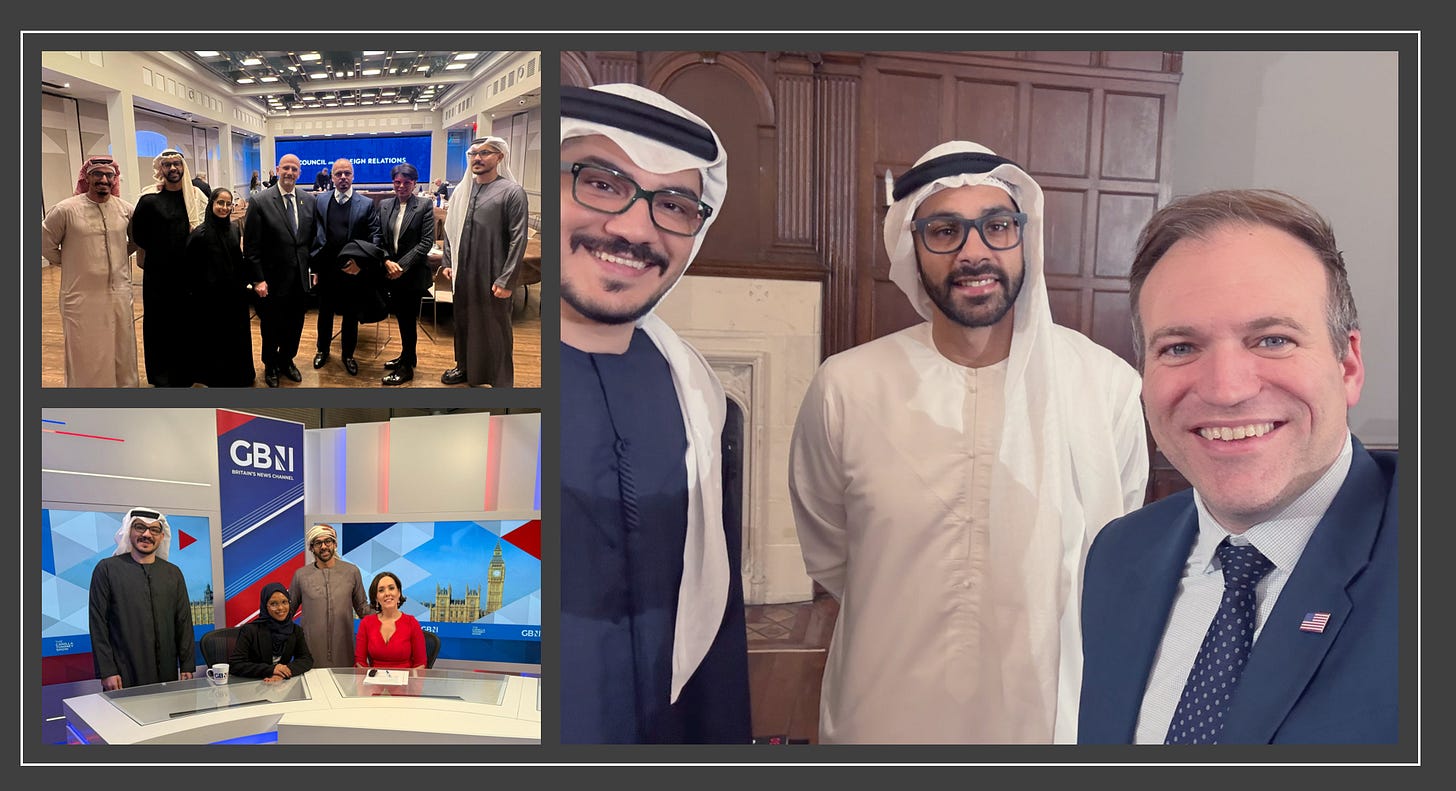 Besides their international jaunts and mutual social media amplification, some members of the gang have also hung out together in the UAE. In this book launch event hosted by Amjad Taha’s Crestnux, you can see members of the gang, including Aesha, AbulQader, and Meera, all attending. There was also another event between Crestnux and the UAE’s New Expert Program, where they spoke with Foreign Affairs expert Maitha Alkaabi. Here you can see Abdulqader, Amjad, and Mozah. Many of the group also met with Ahmed Fouad Al Khatib (a writer whose pieces in the Atlantic have sourced Amjad Taha’s disinformation), although it is not clear if this was a Crestnux event.