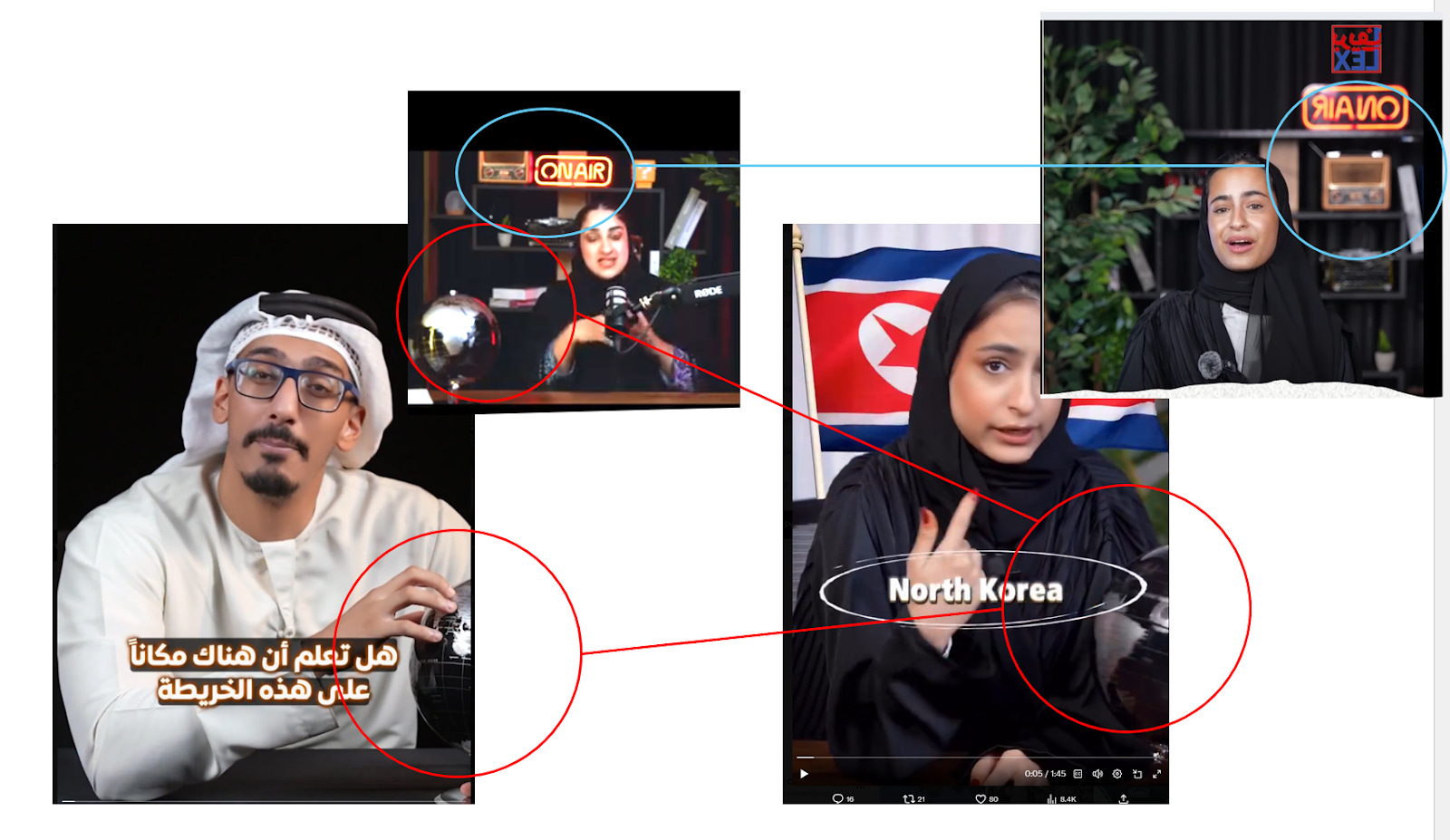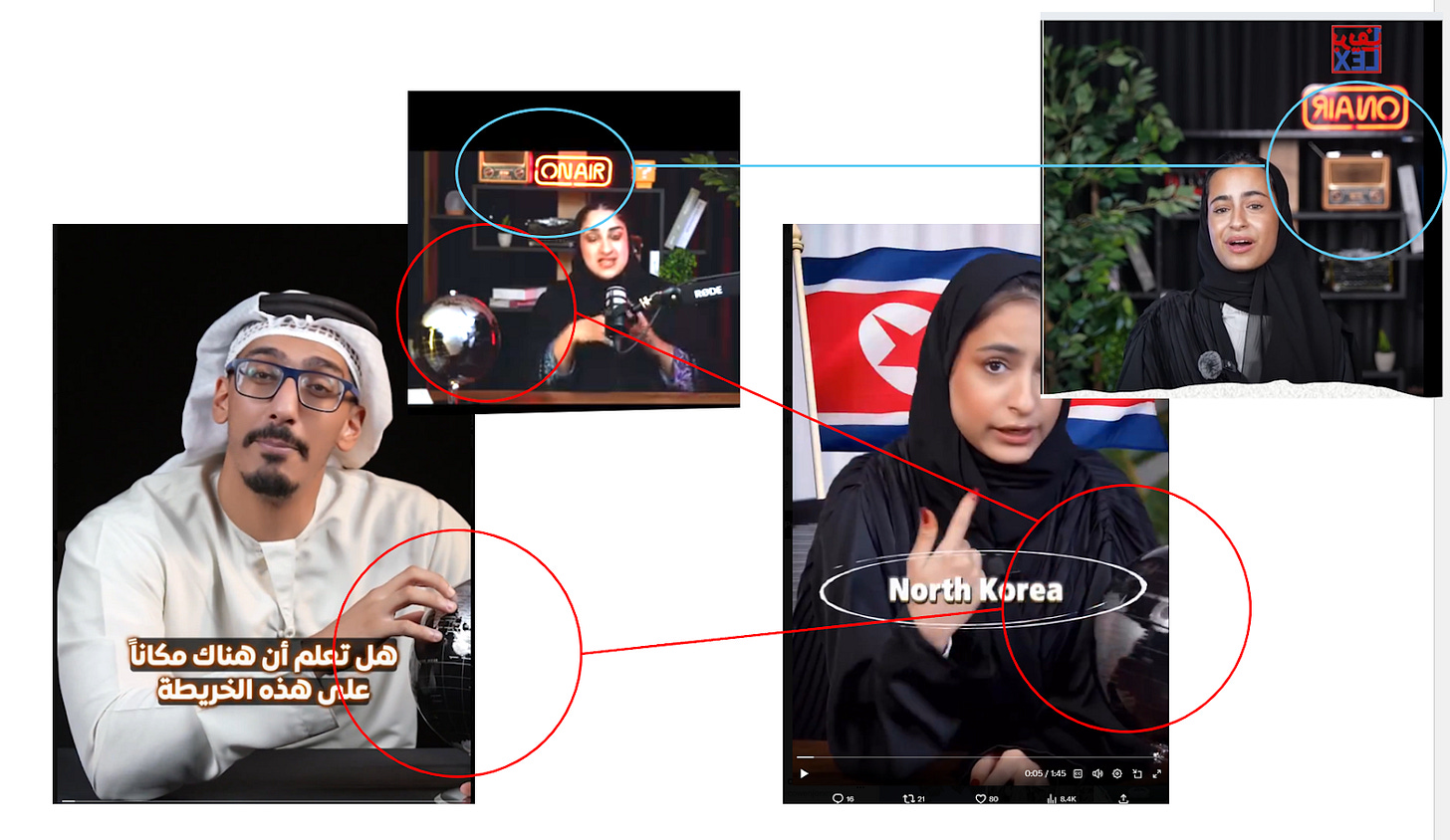 For their frequent video posts, many of them even seem to have been recorded in the same studio. In the below collage, for example you can see the same set dressing, such as a black and silver globe and identical background props. The ‘to-camera’ explainer style is also similar. In terms of filming location, it appears to be connected to an initiative called OnePodcastAE, set up around the same time as the network, and one where members of the gang are featured heavily.