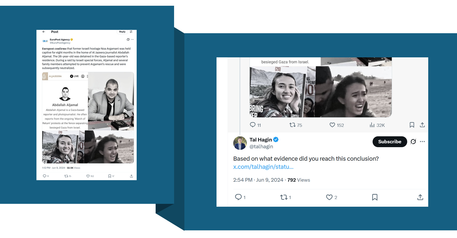 Europost also prompted an outcry when it was pushing explicitly pro-Israel disinformation. It claimed with no evidence that Israeli hostage Noa Argamani was held captive in the home of Al Jazeera journalist Abdallah Aljamal. This prompted OSINT analyst Tal Hagin to inquire as how they knew this.