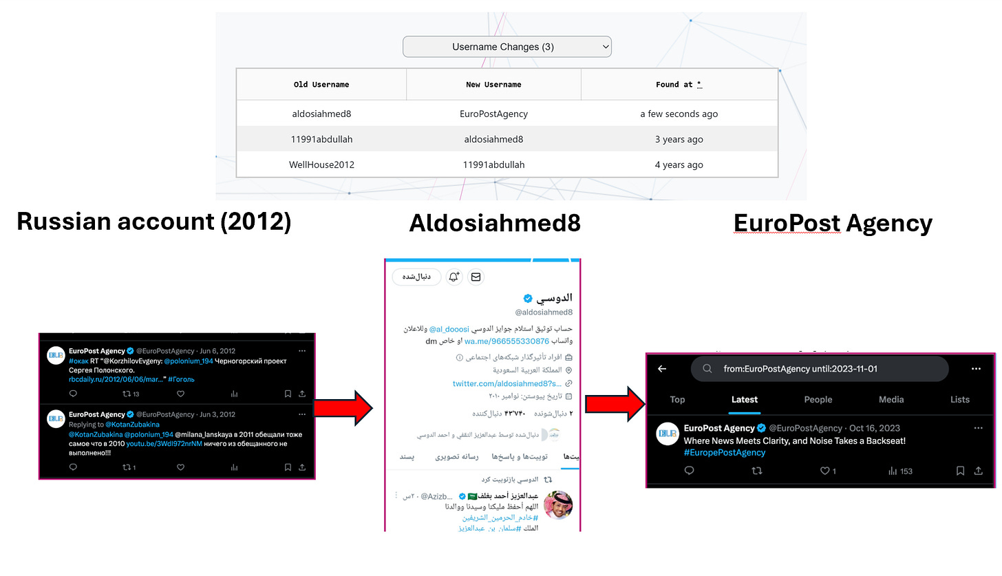 Closer inspection of EuroPost revealed more evidence of it being an influence operation. The domain had been registered only weeks earlier, in June 2023, yet its X account claimed an origin date more than a decade earlier, and had passed through numerous identities, including belonging to someone who posted in Russian.