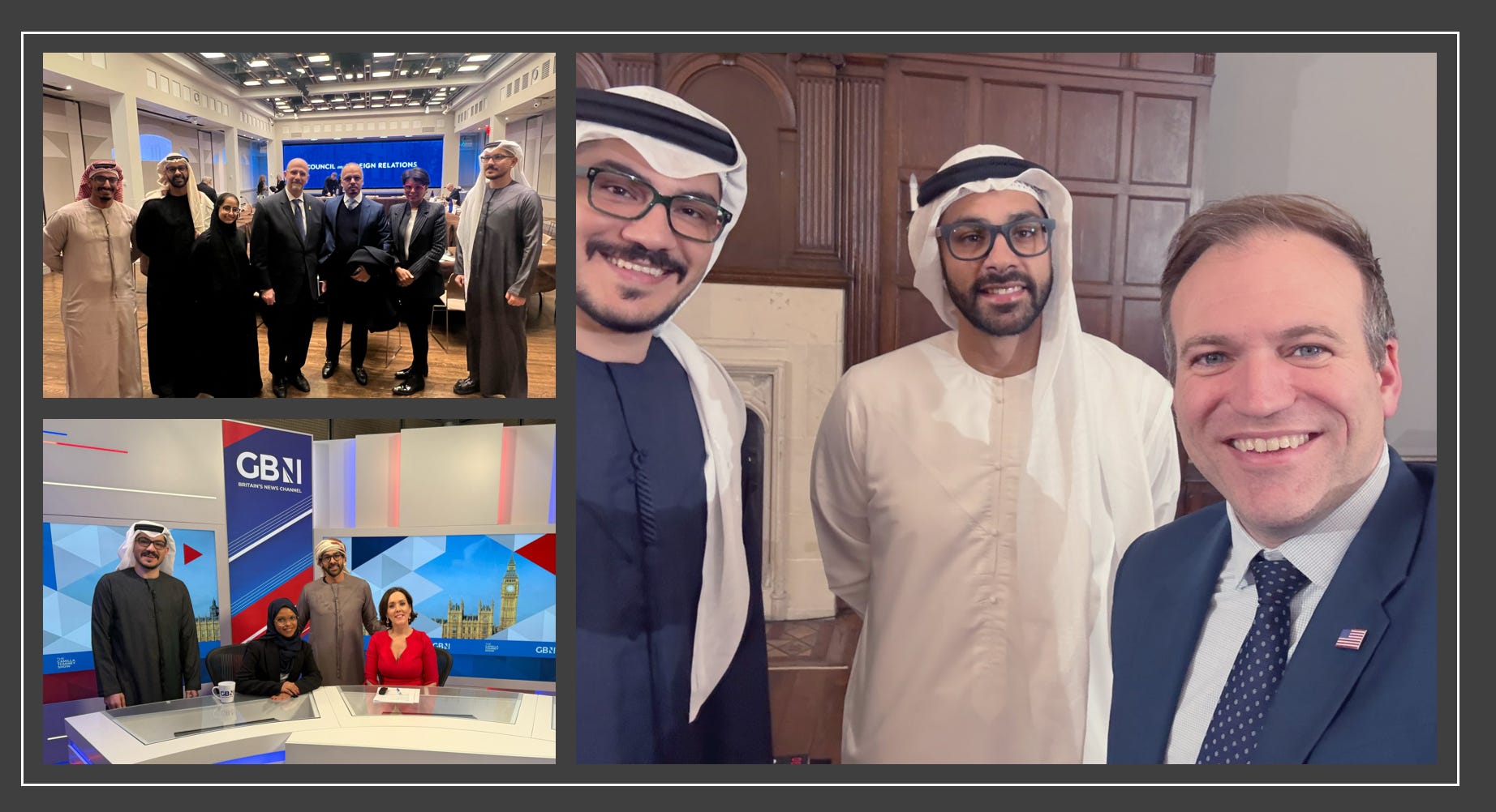 In February 2025, Obaid Al Zaabi, Aesha Ahmed and Amjad Taha attended the right-wing ARC Conference in London. The same trio appeared again that month at the University of Cambridge’s Pinsker Centre. During the London trip, at the same time as the ARC conference, there is a photo of Amjad Taha, Aesha and Obaid posing with Camila Tominey of GB News. (This was, presumably, immediately before the interview with Amjad Taha that resulted in GB news being sued).