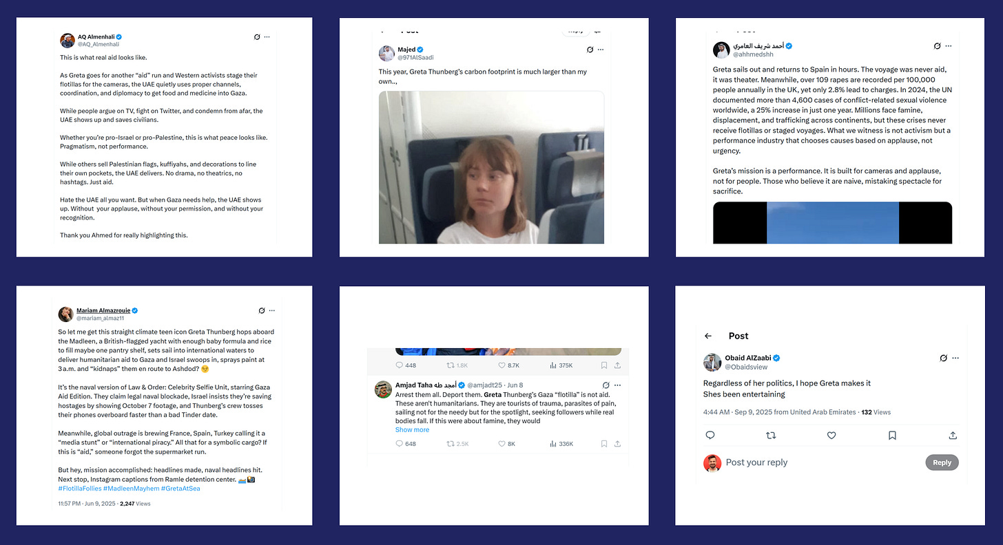 There are numerous other examples of the overlap in the gang’s narrative that seem far too specific to be coincidental. For example, there is a strange shared focus on Greta Thunberg, and criticism of her activism - especially on Palestine - all of which resemble scripted talking points.