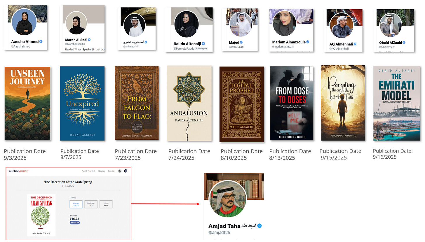 Perhaps the most unhinged and post-truth aspect of all of this though is that at least eight of the gang have published books. I hesitate to use the word ‘written’ because they all show signs of being written by AI. But yes, Aesha, Mozah, Ahmed, Rauda, Majid, Mariam, Abdulqader and Obaid have all written books. And yes, you probably guessed it at this point, they have a lot in common. They were all published within a similar time frame, July - September 2025. They are all published with the same publisher, AuthorHouse. It is also worth noting that AuthorHouse was the same publisher where Amjad Taha published his book ‘The Deception of the Arab Spring’.