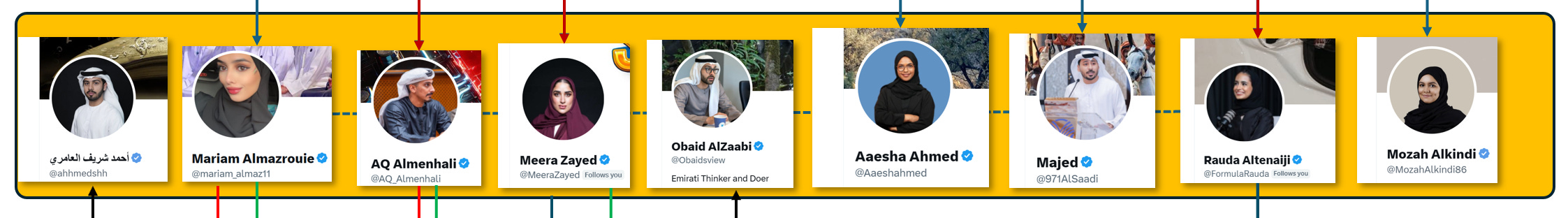 Looking only at X, these accounts display a highly concentrated pattern of creation. Seven of their X accounts were created in December 2024 or January 2025, and these include Rauda Altenaiji (FormulaRauda), Mariam Al Mazroueie (mariam_almaz11), Obaid Al Zaabi (Obaidsview), Abdulqader Almenhali (AQ_Almenhali), Meera Zayed (MeeraZayed), Majed Al Saedi (971AlSaadi), and potentially Khamis Al Hosani (KhamisMalhosani) and Sarah Al Hosani . Associated Instagram accounts, where identifiable, were also created in late 2024 or show no meaningful activity pre-October 2024 activity.