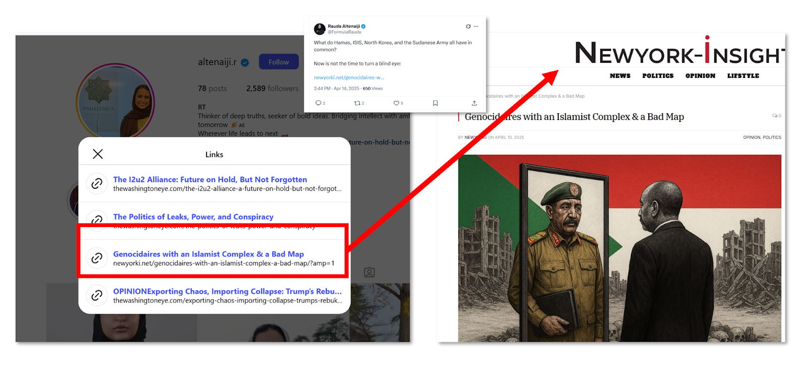 The weirdness does not end there, nor do the seemingly related pseudo news sites, or their connections to Taha. In April 2025, Rauda El Tenaiji (and Adam Grien) wrote an article titled ‘Genocidaires with an Islamist Complex and a Bad Map’ which was published on the website ‘New York Insight’ (spoiler alert, you will gain zero insights by reading their content). Aside from occasional op-ed style contributions, including a piece authored by Rauda Altenaiji, content on New York Insight is published without bylines or identifiable editorial oversight. There is one contact email, info@newyorki.net and a generic address in Manhattan. Even the ‘contact’ us still contains html code.