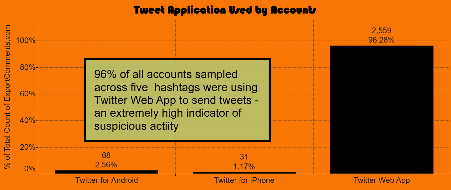 Tweet-source data adds another layer to confirm the overall volume of bots. Across a sample taken across all hashtags, 96% of tweets were sent via Twitter Web App. While this client (application you send your tweets from) is not inherently suspicious, it is usually the botmaster app of choice, and its near-exclusive use at this scale is not typical of organic political discourse and frequently observed in automated or bulk-posting environments. In most typical contexts, twitter for iphone or twitter for android form the majority of clients, as people tweet from their mobile.
