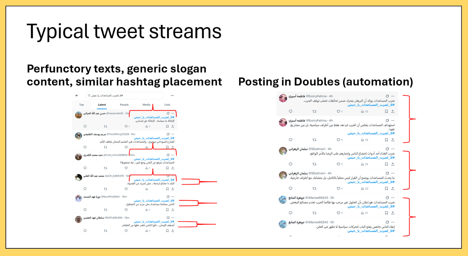This can be summed up as perfunctory text, generic slogan content, similar hashtag placement often duplicate tweets, sometimes posting in doubles.