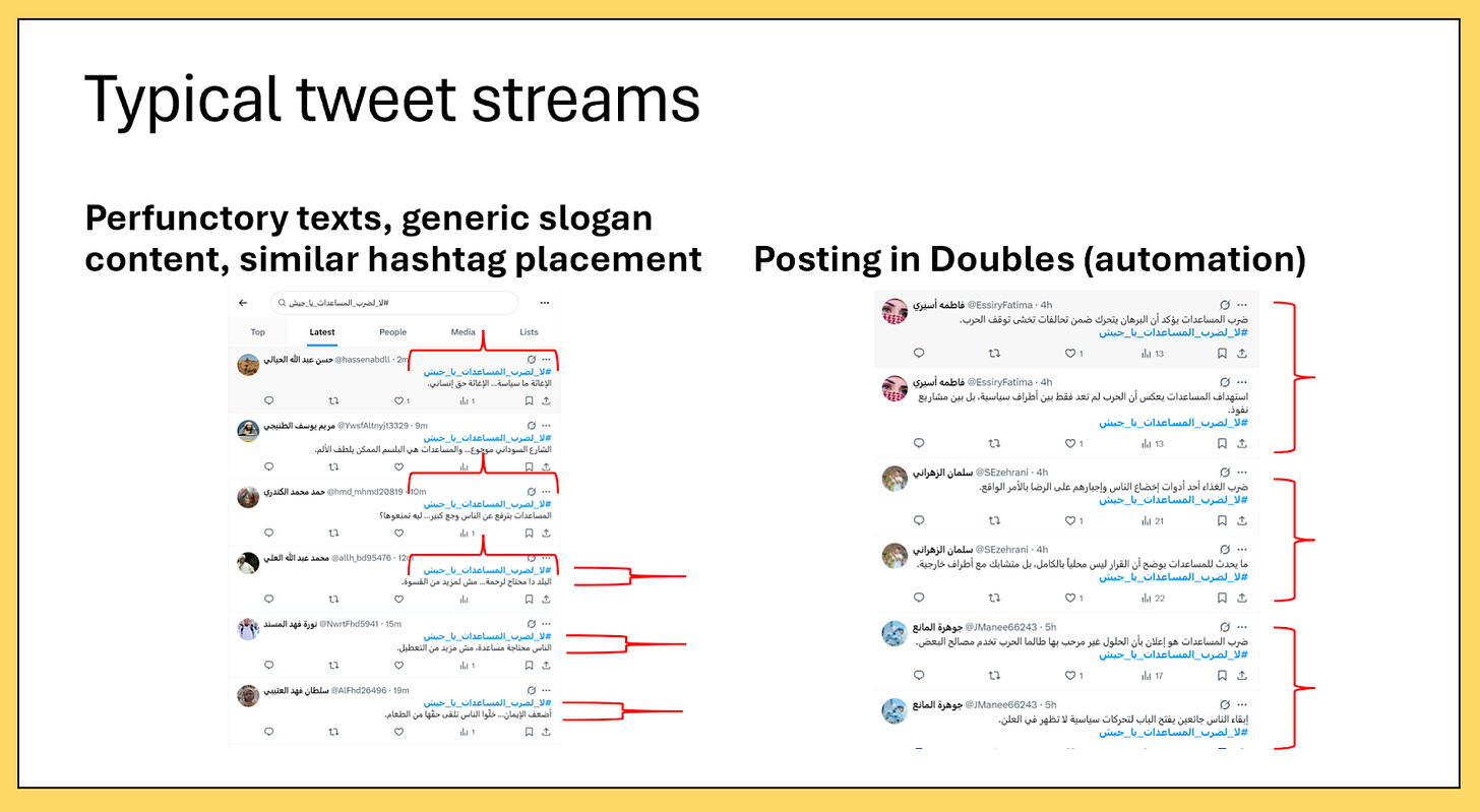 Taken together, the evidence points to a massive, politically aligned influence operation being pushed by approximately 19,000 bots. In the weeks following the El Fasher massacre, roughly 80,000 tweets from around 21,000 accounts generated more than 91 million impressions, with an estimated 89–93 per cent of that activity driven by automated or highly coordinated accounts. These networks worked to rehabilitate the RSF as humanitarian and peace-seeking, externalise blame onto the SAF and its regional backers — Egypt, Saudi Arabia, Qatar, Turkey, Iran, and Russia — and mute scrutiny of the UAE despite its ties to the RSF. The reuse of the same infrastructure across Sudan and southern Yemen underscores that this was not an isolated campaign, but part of a broader, reusable influence apparatus aligned with UAE regional interests. That this scale of synthetic activity was sufficient to repeatedly push hashtags into trending lists also highlights how easily X’s systems can still be gamed: basic velocity, repetition, and account volume remain enough to manufacture visibility, even in the absence of genuine engagement. In an information environment already distorted by war and limited reporting, such amplification attempts to define what appears visible, credible, and true. Finally, 19000 is a lot, and is the largest botnet I have heard of in some time.
