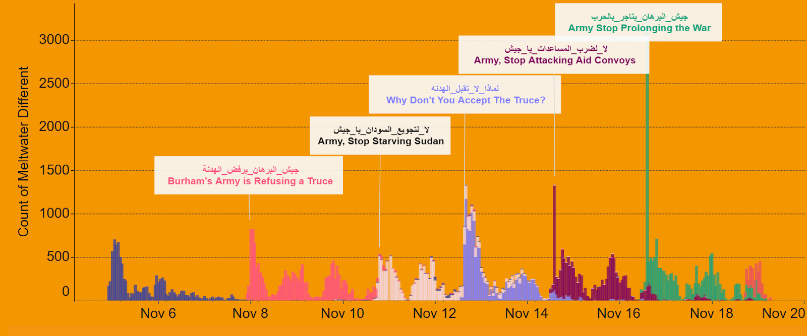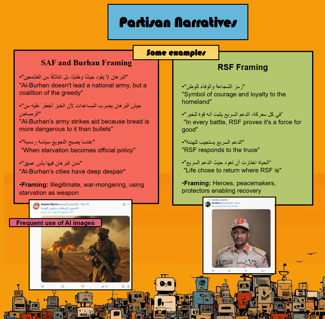 Content analysis across thousands of tweets reveals a high degree of narrative discipline. Regardless of your own views on this, the narrative is very specific: The Sudanese Armed Forces (SAF) and Burhan (head of the SAF) are consistently framed as the primary agents of suffering, and those responsible for rejecting a ceasefire. Hunger is described as deliberate policy rather than wartime consequence. Aid obstruction is depicted as intentional, with repeated claims that humanitarian convoys are bombed. Burhan is portrayed as illegitimate, power-seeking, and subordinated to Islamist elements and foreign patrons. Cities associated with SAF control are described as spaces of despair and decay.