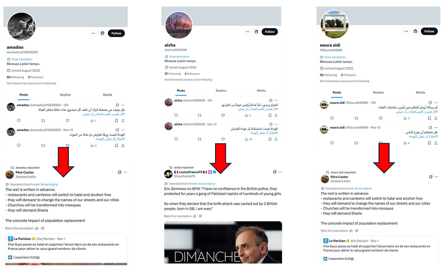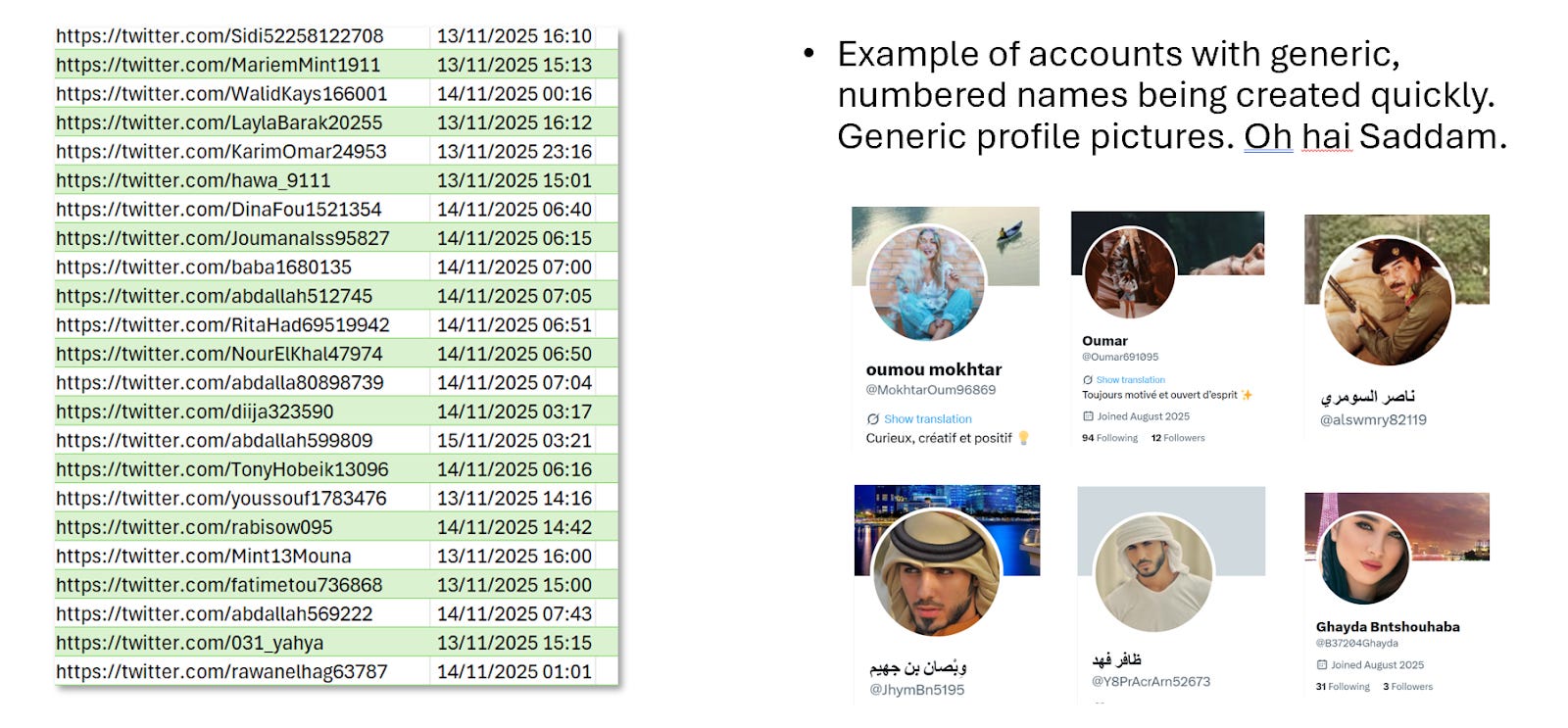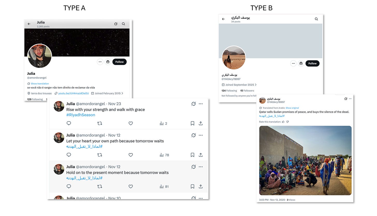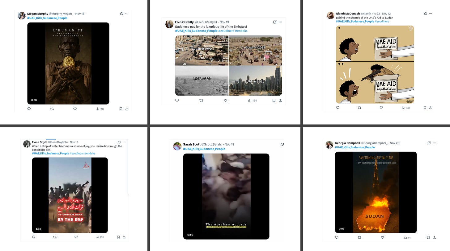 Some accounts show prior histories of amplifying anti-immigrant or anti-Muslim narratives in European contexts before pivoting into Sudan-related content. It is not clear if this is related, but it is interesting given the increasingly documented alignment between UAE/Israel -aligned propaganda and European far right anti-Muslim and anti-immigrant narratives.