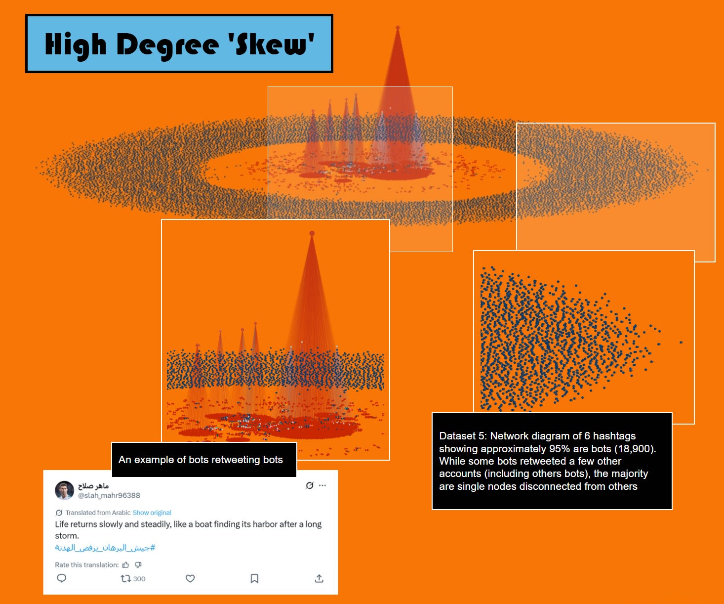 The core analysis is based on a large corpus of approximately 80,000 tweets posted by around 21,000 accounts, collected across a cluster of Sudan-related hashtags between November 5th and November 19th. Other samples were also taken from these hashtags to obtain different metadata markers (yeah Elon made getting X data harder). These included samples focused on individual hashtags to examine ‘anomalies’ in account creation dates, account applications and degree distributions. The emphasis throughout was on triangulation: comparing results across multiple samples, methods, and indicators rather than relying on any single metric. The consistency of findings across these independent slices of data underpins the findings presented here. Samples of tweets were also scraped from high-likelihood bot accounts to analyse narrative themes. Different collection and analysis tools were used at each stage, depending on the task (NodeXL, Phantombuster, Exportcomments, Gephi, Tableau)