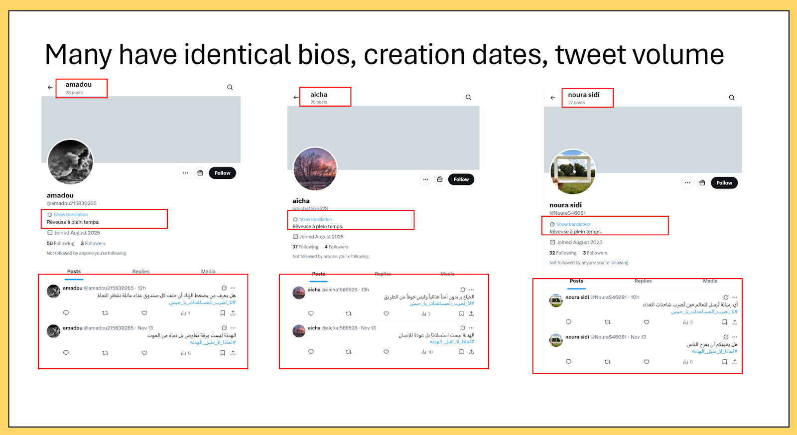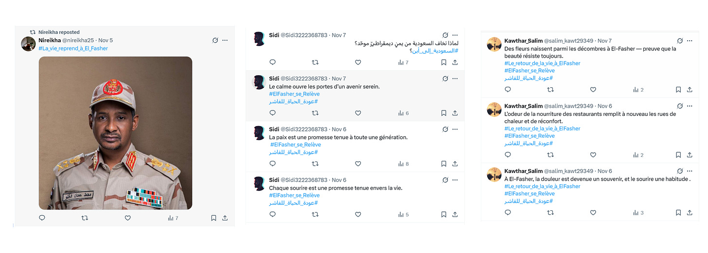 The operation does not appear to target Arabic-speaking audiences alone. A substantial subset of content is produced in French, often using French-language hashtags such as “El Fasher se Releve and Le retouer de la vie a Elfasher (life returns to El Fasher).