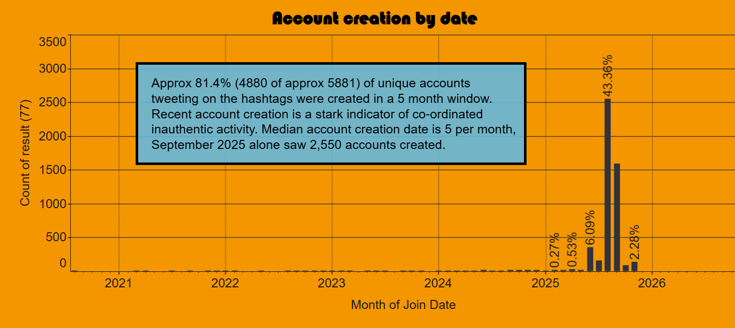 Account-level indicators further support the conclusion that automation dominates this network. Out of a sample of 5,881 unique accounts active on the ‘Al-Burhan’s Army Rejects the Ceasefire’ hashtag, 4,787 (81.4 per cent) were created within a five-month window. One month alone contributed approximately 2,500 newly created accounts, a pattern consistent with coordinated batch creation of accounts for influence operations rather than gradual organic growth.