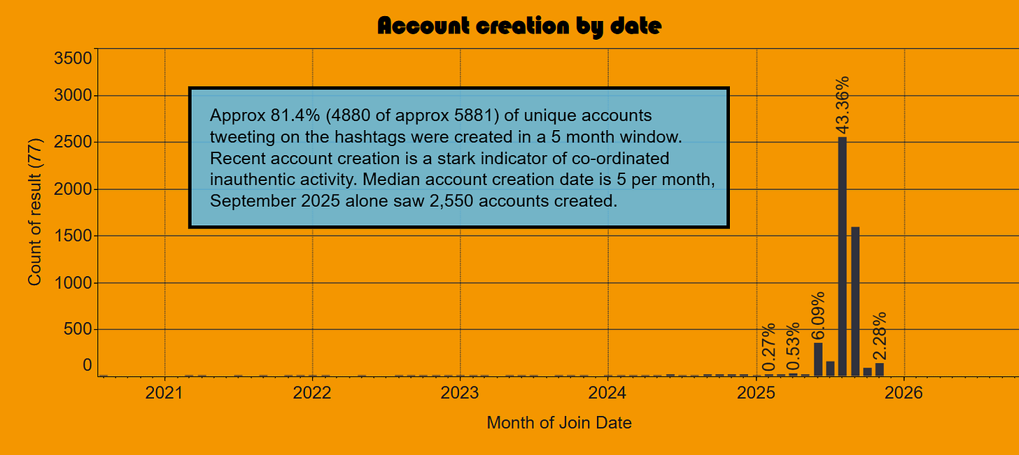 While not every participant was automated, multiple independent indicators show that the bulk of amplification came from accounts exhibiting coordinated, inauthentic behaviour.