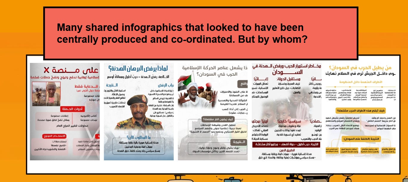Many of the bots shared infographics that appear to be centrally produced and co-ordinated in terms of messaging and aesthetic. As with the rest of the content, they focus on emphasising that the El Fasher massacre is the fault of SAF and the Islamists. These infographics generally appear to be exclusively created to be promoted on the network.