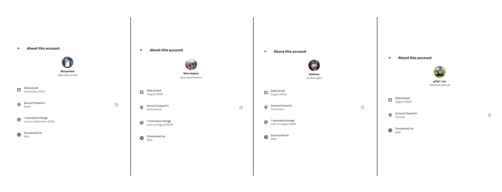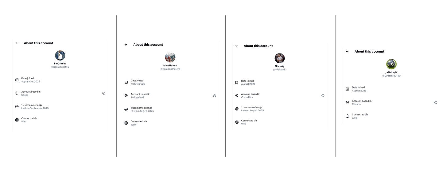 Even if you use the new ability on X to see where accounts are from, the results are bizarre. They also indicate how easy the location system is to game. The random sample of four bot accounts below show they are based in Spain, Switzerland, Costa Rica and Croatia. The distribution almost seems random, indicating whoever is running the campaign has some sort of distributed vpn system.