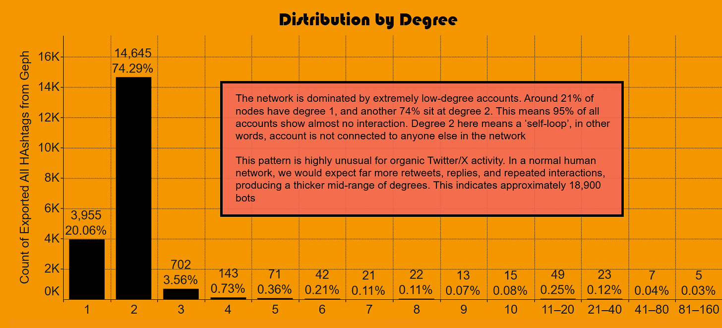 This structure differs sharply from organic political discourse. Even polarised conversations typically show thicker mid-range interaction as users reply, retweet, and cluster. Here, the network collapses almost immediately after degree two. A very small number of accounts exhibit higher degrees—some exceeding 11, 21, or even 40 connections—consistent with a tiny coordinating core surrounded by thousands of accounts simply broadcasting the hashtag.
