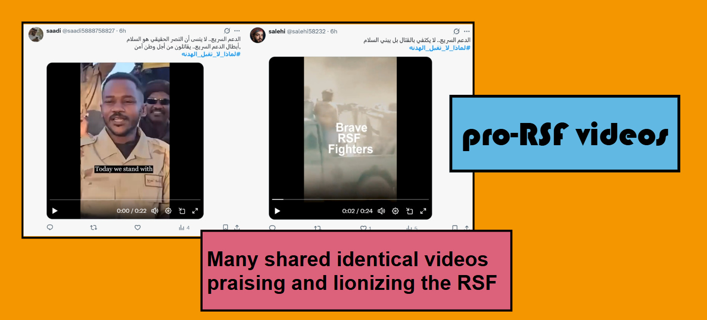 Overall, the dataset reflects a propaganda effort to flood social media with positive information about the RSF, as well as negative information about those countries (and the Muslim Brotherhood) seen as supporting the SAF. The timing also suggests it was an attempt to limit and drown out criticism of the UAE given its support for the RSF. The broader activity of the network also aligns it with UAE foreign policy.
